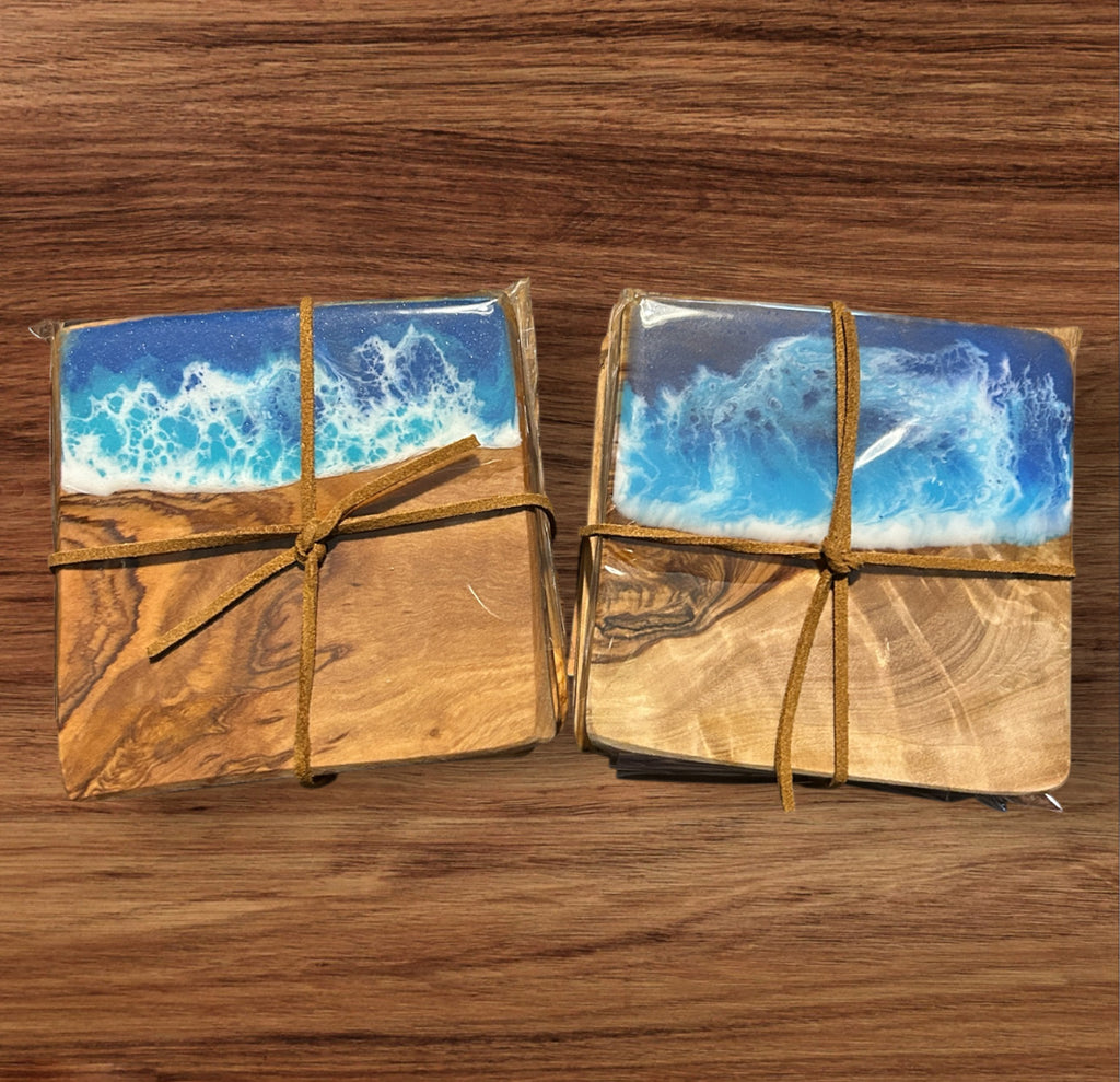 Resin Ocean Themed Olive Wood Square Coaster Set of 4